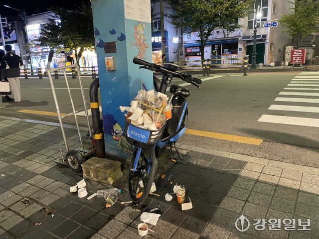 연휴 시작 이후 첫 주말을 맞은 지난 4일 속초중앙시장. 귀성객과 시장 방문객들이 무단으로 버린 각종 생활쓰레기가 보행로 한편과 공유자전거 바구니에 가득 쌓여 있었다.