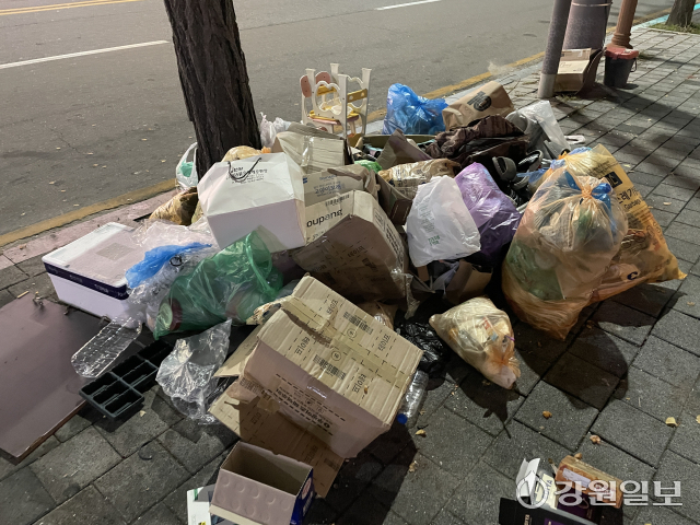 추석 연휴 7일 동안 배출 규정을 지키지 않은 채 버려진 쓰레기로 강원지역 도심 곳곳이 몸살을 앓고 있다.
