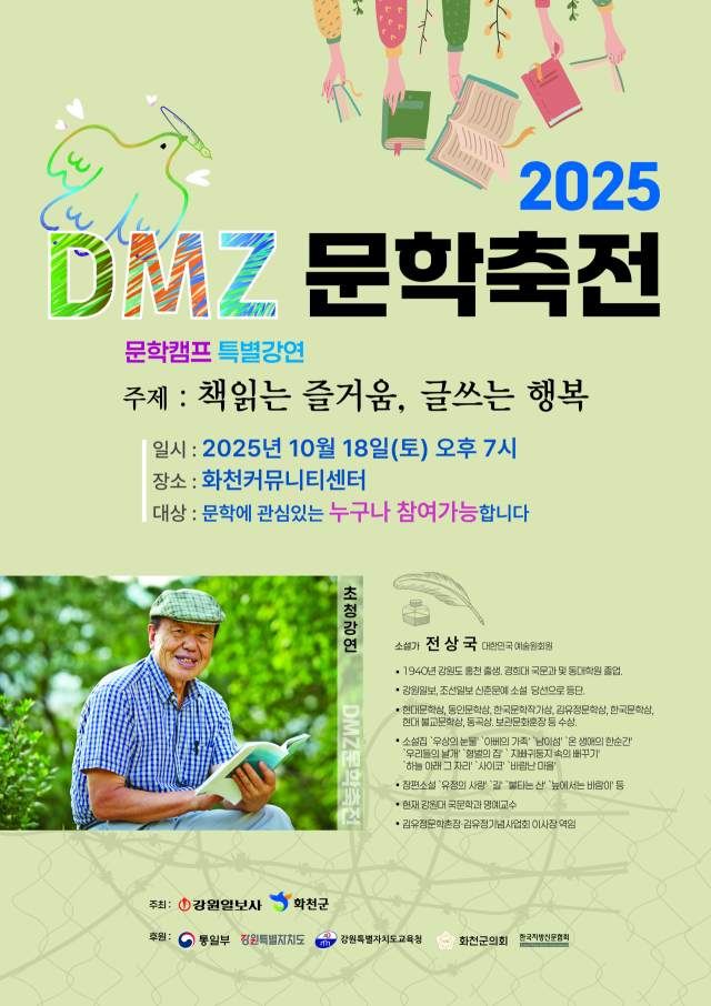 18~19일, 1박 2일 일정으로 열리는 DMZ 문학캠프는 중·고등학생과 대학생, 일반시민 등 다양한 연령층이 참여 가능한 체험형 문학 프로그램으로, 평화의 댐 일대를 걷고, DMZ 접경지의 자연과 역사적 의미를 온몸으로 체감하는 일정으로 구성됐다. 참가자들은 백암산 케이블카를 타고 접경지역의 풍경을 조망하고, 대한민국 예술원 회원으로 분단문학의 대가로 불리는 전상국 작가의 초청강연(18일 오후 7시 화천커뮤니티센터)과 글쓰기 멘토링, 문학 낭독회 등을 통해 자신만의 감정을 문장으로 표현하는 시간을 갖게 된다. 단순한 글쓰기 교육을 넘어, ‘경계에서 살아가는 감각’을 바탕으로 창작의 의미를 일깨우는 데 중점을 둔 프로그램이다. 캠프 참가 신청은 DMZ문학축전 공식 홈페이지(dmzfesta.kr)에서 접수 중이며, 모든 참가자는 다음 날 열리는 ‘DMZ백일장’에 자동으로 참여하게 된다.
