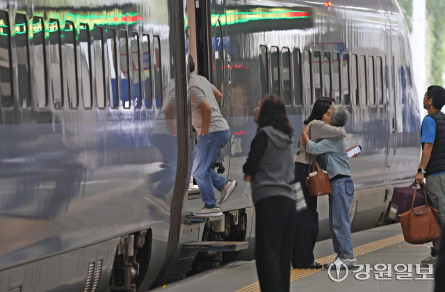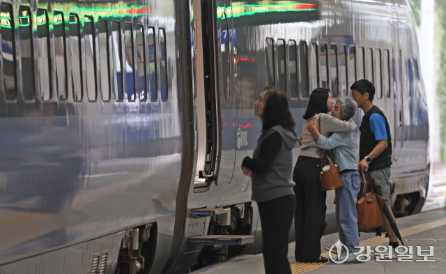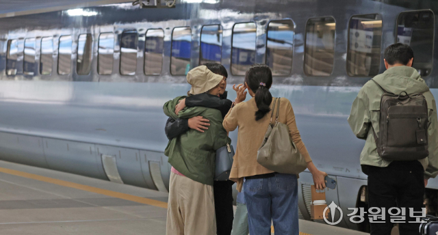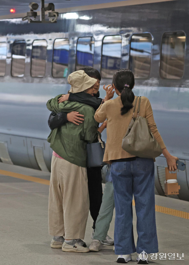 추석 연휴 마지막 날인 9일 KTX강릉역에서 소중한 만남을 뒤로하고 귀경하는 가족들이 인사를 나누고 있다. 강릉=권태명기자