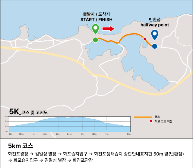 먼저 5㎞ 코스는 화진포 광장을 출발해 호수를 따라 달리다 화진포생태습지 표지판 50m 앞에서 되돌아오는 구간으로, 가족 단위 참가자나 초보 러너에게 안성맞춤이다.