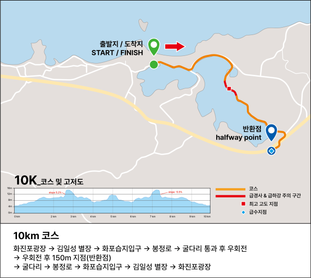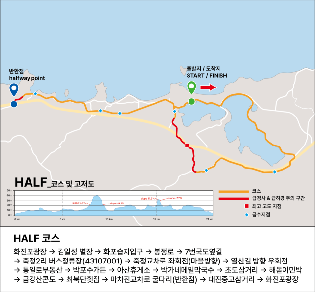대회의 하이라이트인 하프코스는 죽정2리 버스정류장, 통일로부동산, 아산휴게소를 지나 해안도로를 따라 달리다 마차진교차로 굴다리에서 반환해 출발지로 돌아온다. 푸른 동해와 기암괴석이 어우러진 환상적인 풍경 덕에 ‘최고의 러닝 코스’로 꼽힌다.