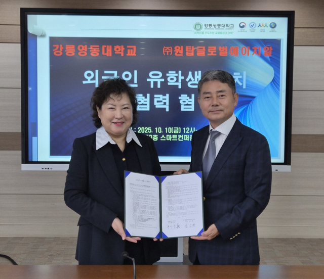 강릉영동대(총장:현인숙)는 지난 10일 ㈜원탑글로벌에이치알(대표:김승환)와 외국인 유학생 유치를 위한 업무협약을 체결했다.