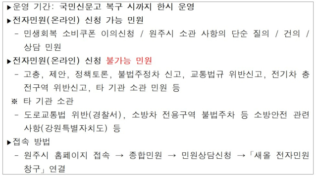 【원주】원주시는 2017년 운영이 중단된 ‘새올 상담민원서비스(상담민원서비스)’를 한시적으로 재개, 국민신문고 임시 대체 창구로 운영한다고 14일 밝혔다.