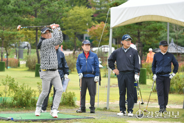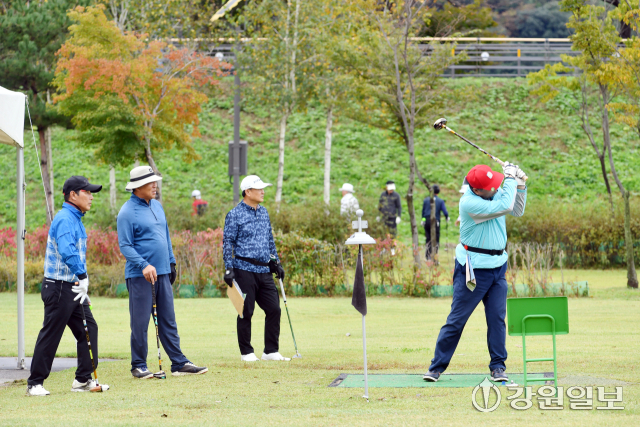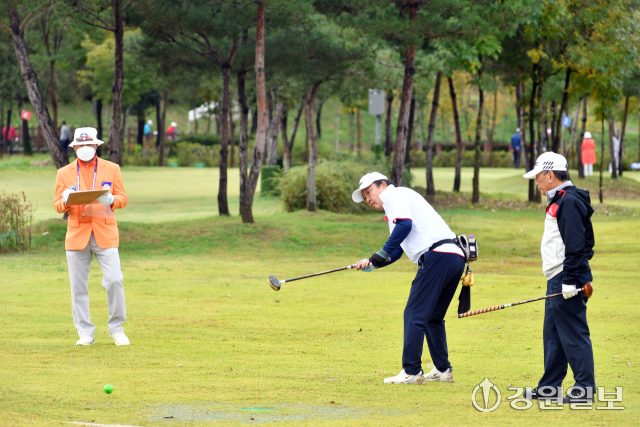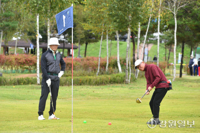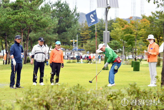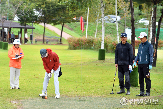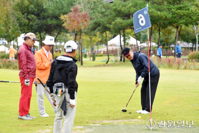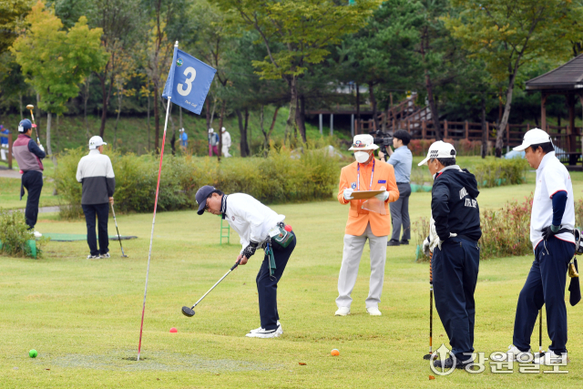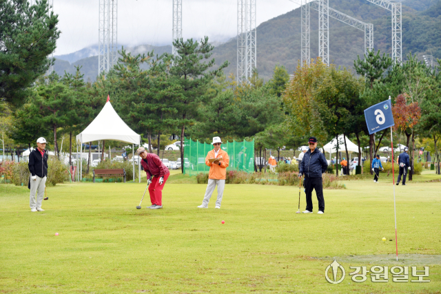 2025 화천 기저질환 건강 전국 파크골프 대회 1차 예선전이 14일 화천군 하남면 생활체육공원 파크골프 경기장에서 열리고 있다. 이 대회는 국내 최초로 기저 질환자만을 대상으로 열리는 전국 단위 파크골프 이벤트다.