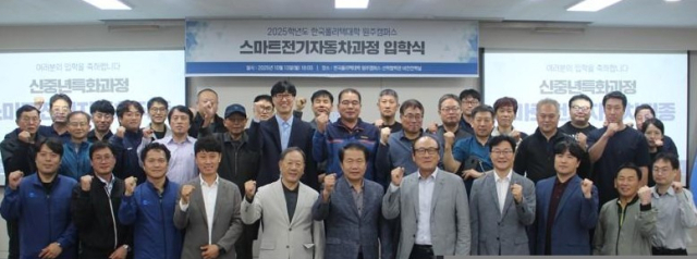 한국폴리텍대학 원주캠퍼스(학장:권민수)는 14일 산학협력관 1층 비전전략실에서 진기철 기아오토큐 서원주서비스 대표, 김주백 현대블루핸즈 서원주서비스 대표, 백행석 강원특별자치도 자동차전문정비사업조합 원주지회장 등이 참석한 가운데 만 40세 이상 신중년을 대상으로 하는 스마트전기자동차과정 입학식을 실시했다.