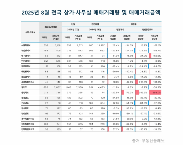 정수민 부동산플래닛 대표는 “전국 부동산 시장이 전반적인 거래 위축을 보인 가운데 상가 사무실 등 전 유형에서 거래금액이 줄었다”며 “9·7 공급대책 영향으로 거래가 주춤했고 경기 불확실성과 내수 회복 지연, 주식시장 강세로 인한 자금 분산, 투자 심리 위축 등이 복합적으로 작용하며 신규 투자 위축과 관망세가 지속된 것으로 보인다”고 설명했다.
