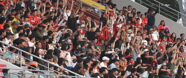 ◇강원FC의 승리를 위해 경기장에 운집해 열띤 응원을 보내고 있는 강원FC 팬들의 모습. 사진=강원일보 DB