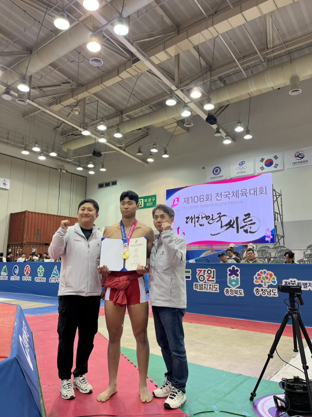 춘천기계공고 3학년 김지섭이 제106회 전국체육대회 씨름 85㎏ 용장급 정상에 우뚝 섰다.