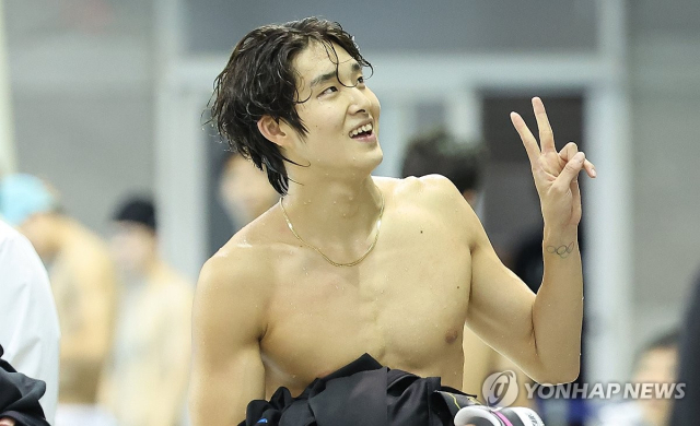 ◇강원도청 김우민이 제106회 전국체육대회에 출전해 팬들에게 인사하고 있다. 사진=연합뉴스