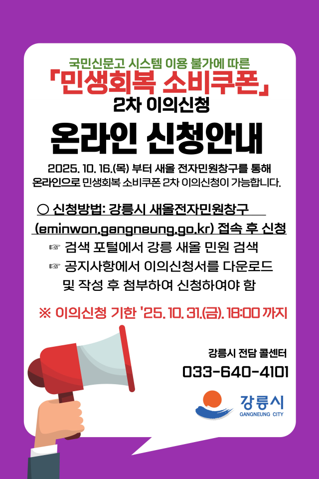 【강릉】강릉시는 최근 발생한 국가정보시스템 장애로 국민신문고 이용이 일시 중단됨에 따라, ‘민생회복 소비쿠폰 2차 이의신청’을 새올 전자민원 상담 창구를 통해 임시 접수한다고 밝혔다.