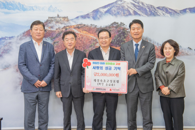 재경속초고성포럼(회장:송삼용)은 20일 고성군청 군수 집무실에서 사랑의 성금 200만원을 함명준 군수에게 기탁했다.
