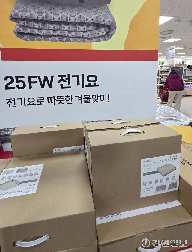 갑자기 서늘해진 날씨에 전기요·극세사 이불 등 한파 대비 용품의 수요가 늘어나고 있다. 20일 도내 한 대형마트에서 전기요가 판매되고 있다. 신세희기자