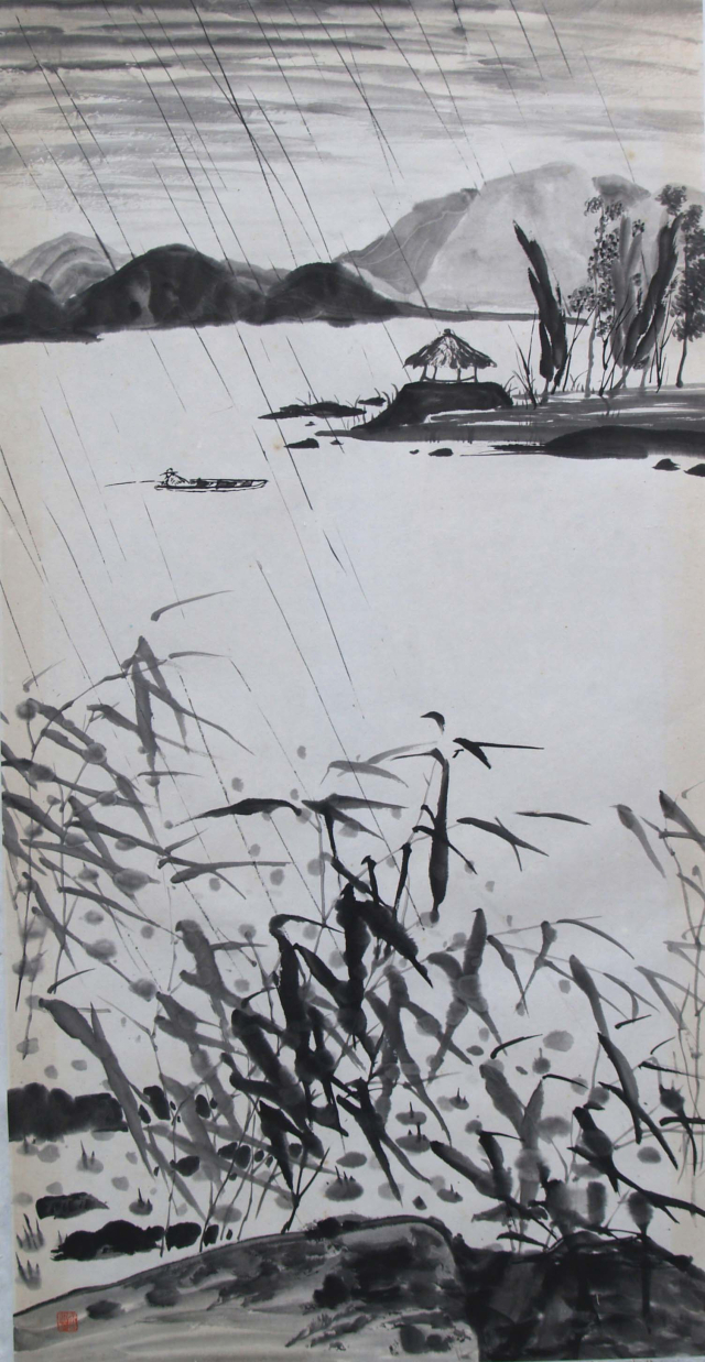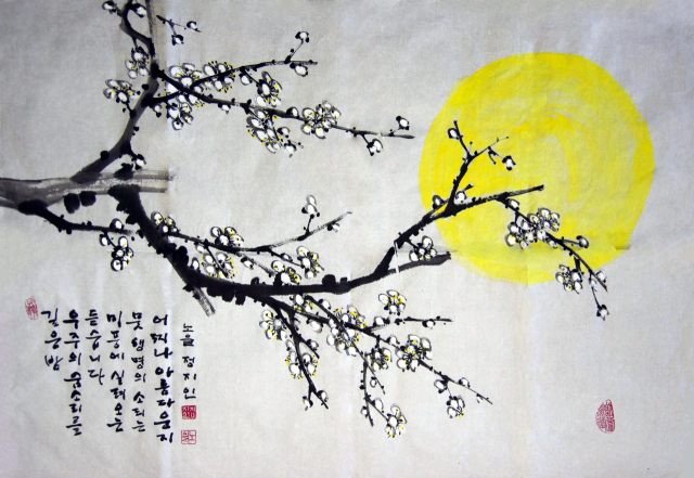 ‘호수에 내리는 비’는 화면을 가득 채운 사선의 빗줄기가 먹의 농담으로 시간을 그려내고, 전경의 갈대는 휘몰아치는 바람의 감각을 붓끝에 실어낸다. 먹의 번짐은 감정의 흐름을 상징하고, 갈대와 배, 그리고 초가는 세상으로부터 한 발 물러선 존재의 태도를 암시하는 듯 하다. 곧고 단정한 먹의 선으로 죽간(竹竿)을 그린 작품은 마치 스스로를 지탱하는 정신처럼 화면을 곧게 관통하고, 가지마다 퍼진 잎은 바람에 흔들리면서도 꺾이지 않는 고요한 힘을 보여준다. 그림 옆에 함께 적힌 시구는 자연을 품은 화폭 위에 인간의 내면과 시대의 정서를 아로새긴다. 매화와 보름달을 화면에 등장시킨 또다른 작품은 전통 회화의 상징적 모티프를 통해 계절과 감정을 함께 담아낸 수묵채색화로 먹선의 절제와 노란 채색의 과감함이 조화를 이루며, 화면 전체가 한 편의 시처럼 구성된 모습이 인상적이다.