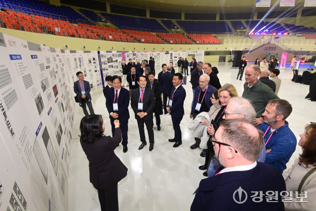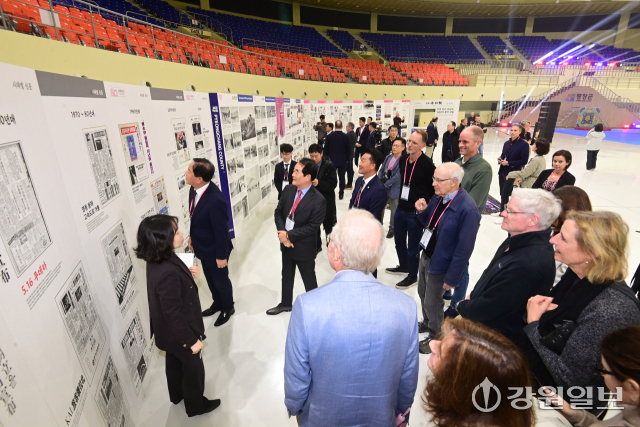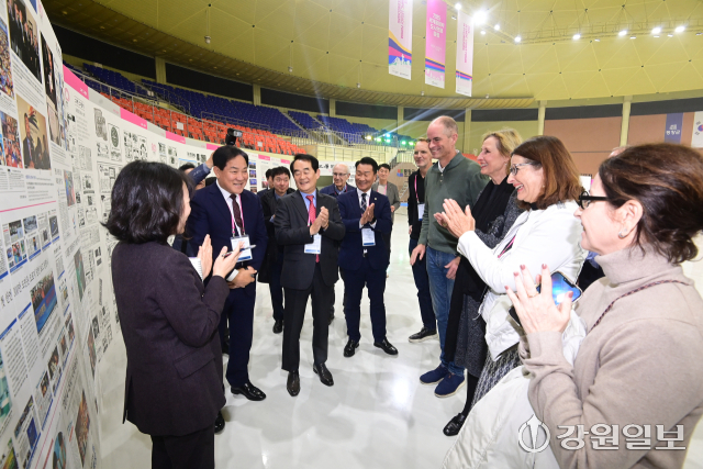 강원일보가 마련한 ‘강원의 역사전–평창의 어제와 오늘’ 사진전이 22일 세계 올림픽도시 관계자들이 한자리에 모이는 ‘2025 세계올림픽도시연맹총회’ 환영행사장인 평창돔에서 열려 심재국 평창군수, 박진오 강원일보 사장을 비롯한 IOC 관계자 및 25개국의 38개 도시 관계자 160여명이 전시된 사진을 둘러보고 있다. 이번 전시는 평창동계올림픽 유치를 위한 도전과 성공의 극적인 순간뿐 아니라 과거 강원도와 평창의 동계스포츠 역사 등을 신문 지면에 실린 사료를 중심으로 재구성했다.