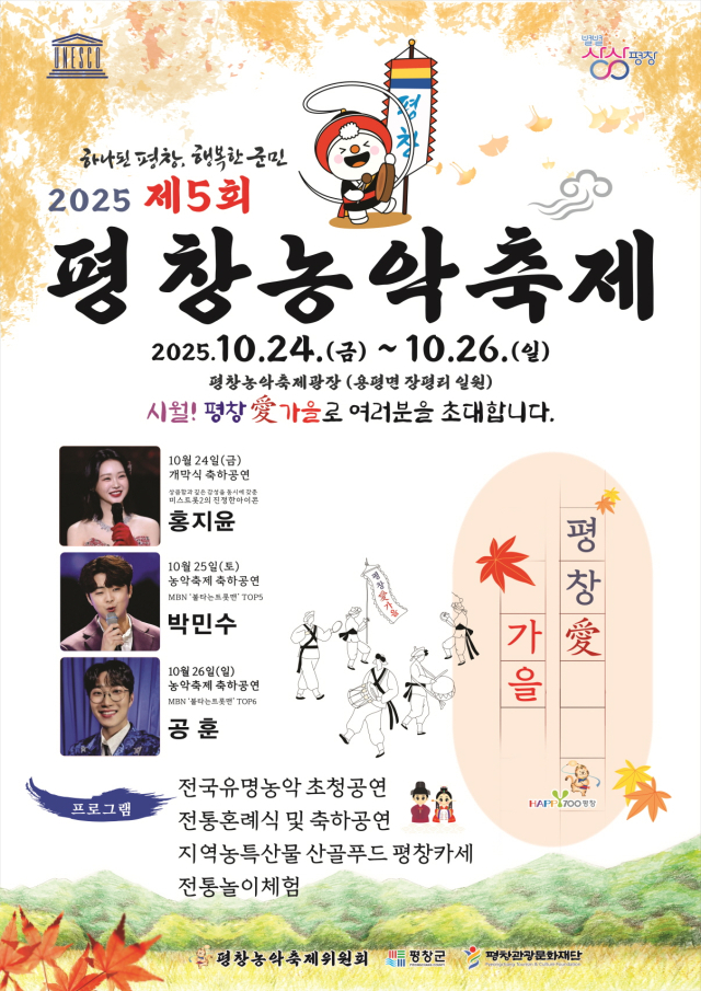 축제 기간에는 △전국 농악 공연 △마당극 △전통 농기구 전시 △체험 마당(오징어게임·전통놀이·민속체험 등) △전통음식 장터(평창카세·장작구이 등) △예술인 버스킹 공연 등 남녀노소 누구나 즐길 수 있는 참여형 프로그램이 진행된다.