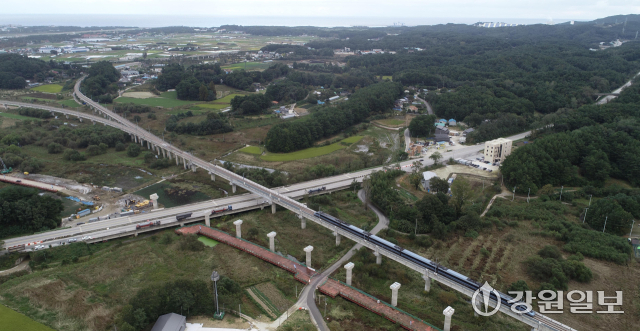 ◇‘철도 르네상스’ 한반도 중심으로 - 강원과 수도권을 잇는 동서고속화철도와 남북 및 동해안 연계를 위한 동해북부선 사업이 본궤도에 오르며 교통 소외지역이었던 강원특별자치도가 철도 르네상스 시대를 맞이하고 있다. 2028년 개통 예정인 '강릉~제진 동해북부선 고속철도'의 강릉시 외곽지역 공사가 한창인 가운데 23일 공사현장 옆으로 강릉과 서울을 오가는 KTX 열차가 지나가고 있다. 강릉=권태명 기자 kwon80@kwnews.co.kr