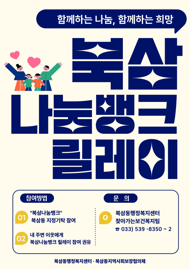동해시 북삼동행정복지센터(동장:심진숙)는 복지 사각지대 해소를 위한 지역사회 나눔 기금인 북삼 나눔뱅크’ 릴레이 운영을 본격적으로 시작했다고 26일 밝혔다.