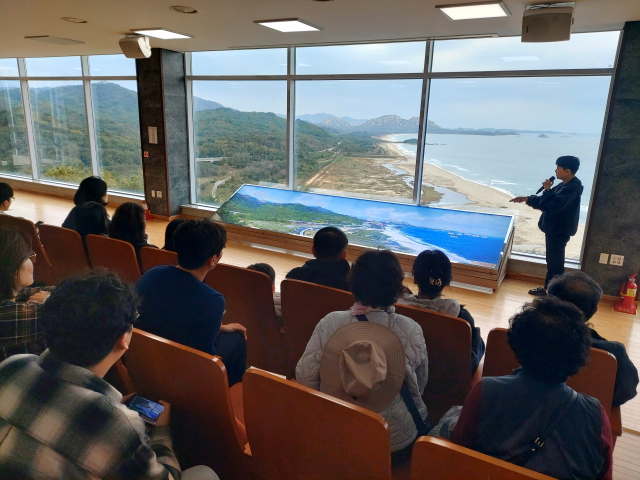 고성 지역에 연일된 비가 소강상태를 보인 26일 휴일을 맞은 관광객들이 고성 통일전망대를 찾아 금강산과 구성봉, 해금강 등을 관람했다.