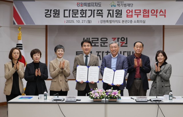 강원특별자치도와 재단법인 박기범재단(이사장:박수안)은 27일 도청 본관 2층 소회의실에서 강원 다문화가족 지원을 위한 업무협약식을 가졌다.