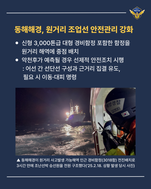 이에 동해해경은 신형 3,000톤급 대형 경비함정을 포함한 함정을 원거리해역에 중점 배치하고, 악천후가 예측될 경우 사전 판단회의를 통해 선제적 안전조치를 시행한다. 또한, 어선 간 선단선 구성과 근거리 집결을 유도하고, 필요 시 이동·대피 명령을 내려 안전 해역으로 유도할 계획이다.