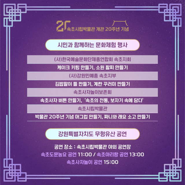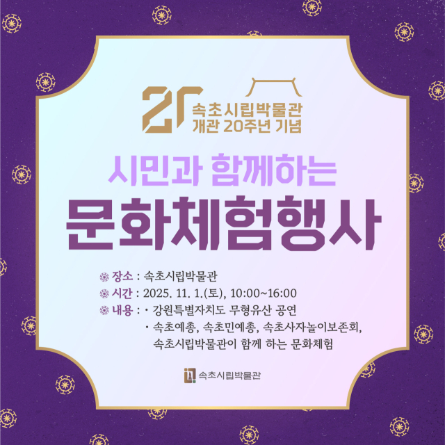 【속초】속초시립박물관은 오는 11월 1일 개관 20주년을 맞아 ‘시민과 함께하는 문화체험행사’를 개최한다.