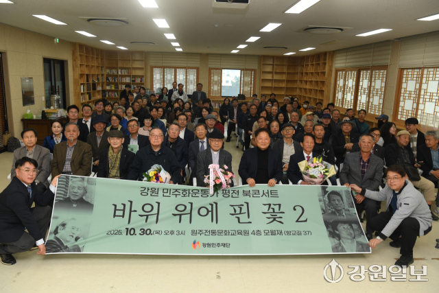 강원민주재단(이사장;최윤)은 30일 원주전통문화교육원 모월재에서 이상진 강원기독인정의평화위원회 위원장, 한경호 원로목사, 박정원 상지대 명예교수, 구자열 전 강원도지사 비서실장등 시민 120여명이 참석한 가운데 최기식, 유남섬, 장을병, 배진 강원 민주화운동가 평전 바위 위에 핀 꽃2 북 콘서트를 가졌다. 원주=김남덕기자강원민주재단(이사장;최윤)은 30일 원주전통문화교육원 모월재에서 이상진 강원기독인정의평화위원회 위원장, 한경호 원로목사, 박정원 상지대 명예교수, 구자열 전 강원도지사 비서실장등 시민 120여명이 참석한 가운데 최기식, 유남섬, 장을병, 배진 강원 민주화운동가 평전 바위 위에 핀 꽃2 북 콘서트를 가졌다. 원주=김남덕기자