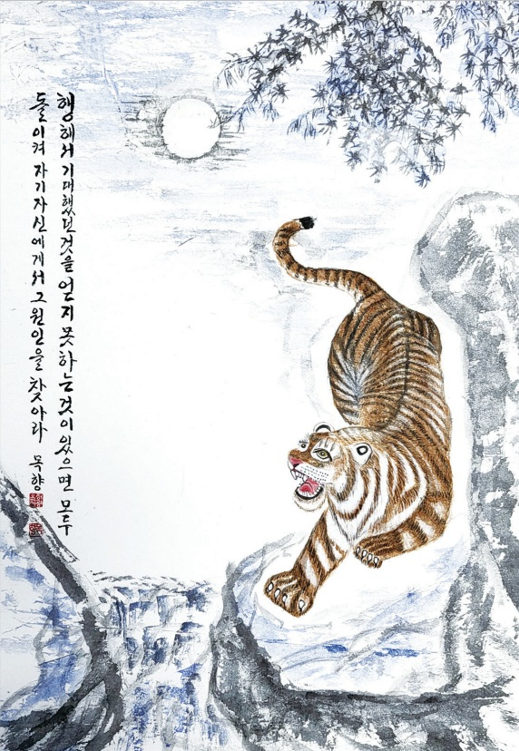 호랑이는 예로부터 우리 민족에게 수호신이자 풍요와 영물의 상징으로, 정 서예가는 이번 작품에서 호랑이에 깃든 기백과 생명력을 서예적 필치로 표현해 강렬함과 부드러움이 공존하는 조화를 보여준다. 힘차게 뻗어나가는 획의 기운과 완연한 곡선의 유연함 속에서 전통 서예의 미감과 현대적 감성이 한데 어우러진다. 이번 전시는 서예의 아름다움과 더불어 우리 민족의 정신적 상징인 호랑이의 기상을 예술로 승화시킨 의미 있는 자리로, 강원 방문의 해를 맞아 더욱 깊은 울림을 전한다.