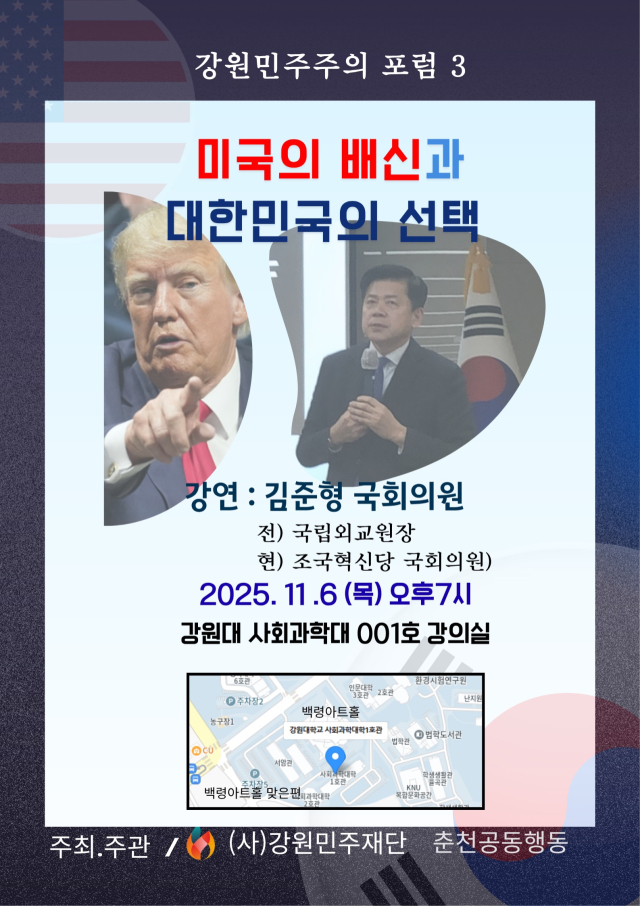 강원민주재단은 오는 6일 오후 7시 강원대 사회과학대 001호 강의실에서 ‘미국의 배신과 대한민국의 선택’을 주제로 포럼을 연다.