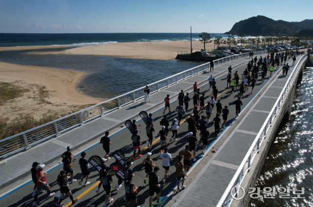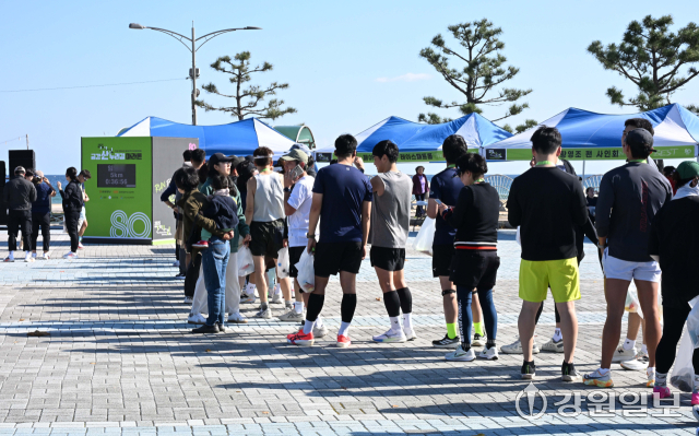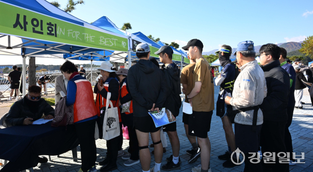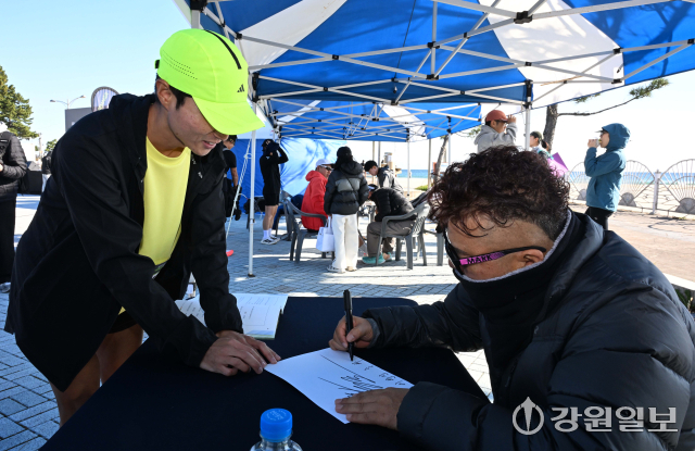 2025 금강산 누리길 마라톤에 참여한 주자들이 달리고 있는 모습. 신세희기자황영조 국민체육진흥공단 감독(1992년 바르셀로나 올림픽 마라톤 금메달리스트)이 2025 금강산 누리길 마라톤을 앞두고 팬 사인회를 하고 있다. 신세희기자사인하는 황영조 국민체육진흥공단 감독(1992년 바르셀로나 올림픽 마라톤 금메달리스트). 신세희기자2025 금강산 누리길 마라톤에 참여한 주자들이 자신의 기록을 남기기 위해 줄 서 있다. 신세희기자