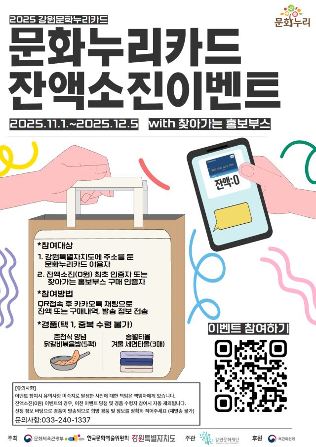 또한 재단은 다음달 5일까지 잔액소진 이벤트도 함께 진행한다. 이용자들은 문화누리카드 지원금 0원 인증 또는 홍보부스 구매내역 인증을 통해 이벤트에 응모할 수 있다. 신현상 대표이사는 “문화누리카드는 일상의 문화 향유를 지원하는 중요한 제도로, 찾아가는 홍보부스를 통해 보다 많은 도민들이 문화누리카드를 쉽고 편리하게 이용하길 바란다”고 밝혔다.