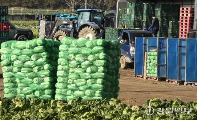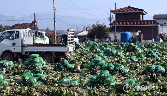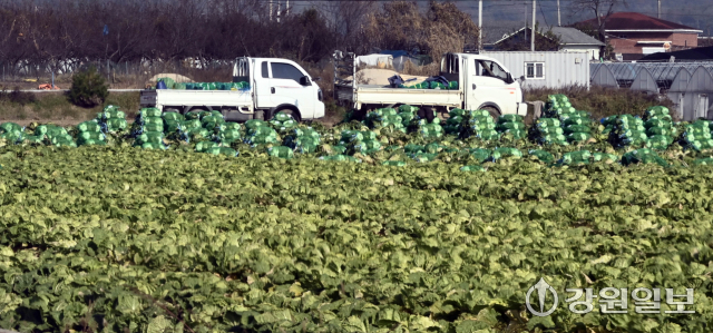 사진은 5일 춘천 서면에서 배추를 수확하는 모습.
