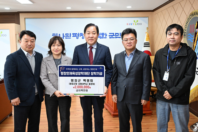 평창군청 강원대학교 동문회인 백령회(회장:김경숙·사진 왼쪽 두번째)은 6일 군수집무실에서 평창인재육성장학재단(이사장:심재국 평창군수)에 장학금 200만원을 기탁했다.