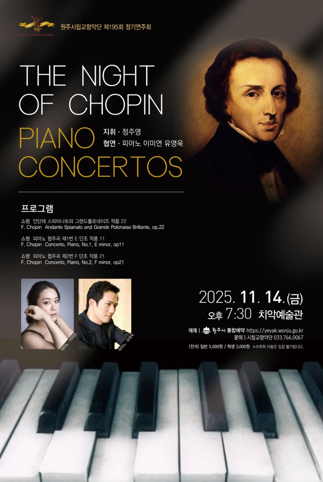 원주시립교향악단의 제195회 정기연주회 ‘The Night of Chopin’이 오는 14일 치악예술관에서 펼쳐진다.