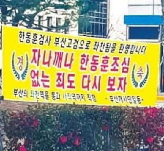 그는 "지난 2020년 1월, 문재인 정권 당시 정권이 반대하던 조국 수사 후 제가 좌천 당했을 때 민주당 강성 지지자들이 부산에 걸었던 현수막"이라면서 "그 후 네 번 좌천 당하는 동안 계속 따라다녔다"고 현수막과 관련한 에피소드를 설명했다.