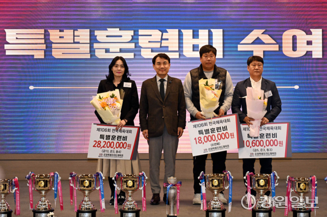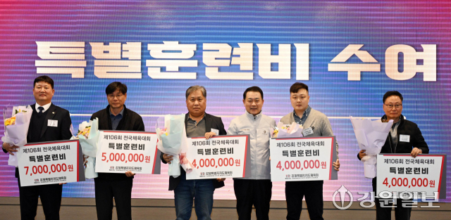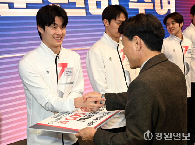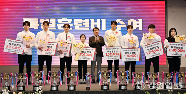 전국체육대회 강원자치도 선수단 6위 달성 환영행사가 10일 춘천 스카이컨벤션에서 선수단과 김진태 지사, 김시성 도의장, 신경호 교육감, 양희구 도체육회장, 박진오 강원일보 사장을 비롯한 내빈들이 참석한 가운데 열렸다. 신세희기자김진태 지사가 10일 춘천 스카이컨벤션웨딩홀에서 열린 전국체육대회 강원자치도 선수단 6위 달성 환영 행사에서 지도자 이보은(수영), 정기훈(테니스), 양윤철(체조)에게 특별훈련비를 전달하고 있다. 신세희기자김진태 지사가 10일 춘천 스카이컨벤션웨딩홀에서 열린 전국체육대회 강원자치도 선수단 6위 달성 환영 행사에서 황선우(MVP·수영), 양재훈(5관왕·수영), 신솔이(5관왕·체조), 김우민(4관왕·수영), 김영범(4관왕·수영), 최동열(4관왕·수영), 원종범(3관왕·역도), 심도은(3관왕·심도은)에게 특별훈련비를 전달하고 있다. 신세희기자김시성 도의장이 10일 춘천 스카이컨벤션웨딩홀에서 열린 전국체육대회 강원자치도 선수단 6위 달성 환영 행사에서 종목별 종합 2위 단체에 특별훈련비를 전달하고 있다. 신세희기자신경호 교육감이 10일 춘천 스카이컨벤션웨딩홀에서 열린 전국체육대회 강원자치도 선수단 6위 달성 환영 행사에서 종목별 종합 3위 단체에 특별훈련비를 전달하고 있다. 신세희기자제106회 전국체육대회 최우수선수(MVP)로 선정된 황선우 선수가 10일 춘천스카이컨벤션웨딩홀에서 열린 선수단 환영행사에서 특별훈련비 500만원을 받고 있다. 황 선수는 자유형 200m 결승에서 1분43초92의 아시아 신기록을 세웠다. 신세희기자제106회 전국체육대회 최우수선수(MVP)로 선정된 황선우 선수가 10일 춘천스카이컨벤션웨딩홀에서 열린 선수단 환영행사에서 감사인사를 하고 있다. 황 선수는 자유형 200m 결승에서 1분43초92의 아시아 신기록을 세웠다. 신세희기자5관왕을 달성한 신솔이 선수가 10일 춘천스카이컨벤션웨딩홀에서 열린 선수단 환영행사에서 감사인사를 하고 있다. 신 선수는 단체·개인종합·마루 운동·평균대·도마 등에서 5관왕에 오르며 대회를 지배했다. 신세희기자10일 춘천 스카이컨벤션에서 열린 전국체육대회 강원자치도 선수단 6위 달성 환영행사에서 카퍼레이드를 마친 선수단이 김진태 지사, 김시성 도의장, 신경호 교육감에게 손을 흔들고 있다. 신세희기자