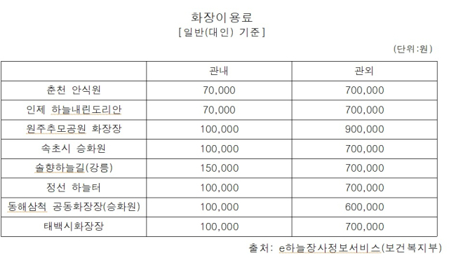 이외에도 동해삼척 공동화장장(승화원)은 지역민 10만원, 타 지역민 60만원 등 최소 6배에서 많게는 10배의 경제 부담 격차가 발생하고 있다.