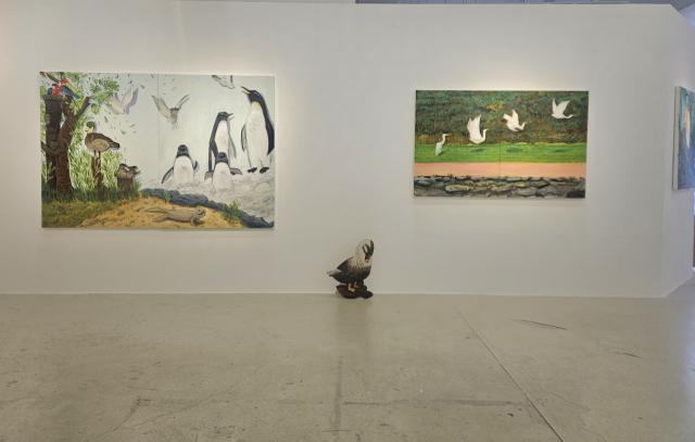 이번 전시는 익숙한 일상 속 사물과 존재들을 새로운 시선으로 바라보며, 우리가 무심히 지나치는 것들 속에 깃든 ‘인연’과 ‘자리’의 의미를 되묻는다. 주로 물오리 등 새를 그려왔던 전 작가는 이번 전시에서 ‘익룡’의 등장을 통해 현실과 상상의 경계를 허물고 익숙함을 낯설게 바라보게 만들었다. 전 작가가 만들어내는 가상의 공간은 일상과 환상의 경계선에서 사라진 존재들이 다시 등장하는 연극의 마지막 막(幕)처럼 느껴진다.