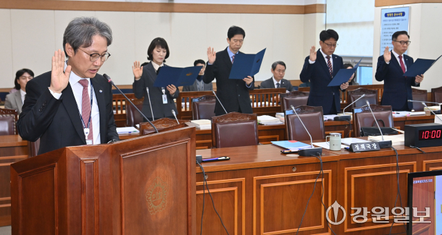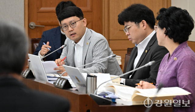 강원특별자치도의회 교육위원회(위원장:이영욱)는 11일 위원회 회의실에서 도교육청 정책국에 대한 행정사무감사를 실시했다. 최재민(국민의힘·원주) 의원이 도내 학교 현장 태블릿PC 추가 구매·배포 계획과 관련해 질의하고 있다. 박승선기자