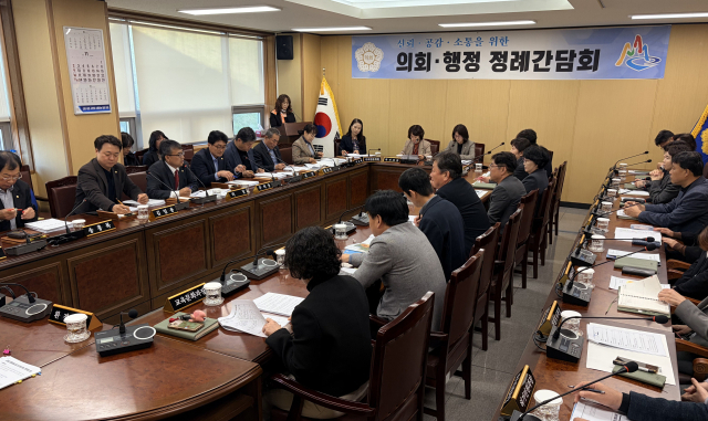 고성군의회(의장:용광열)는 12일 의회 소회의실에서 용광열 고성군의장과 전철수 고성부군수 등이 참석한 가운데 11월 의회·행정 정례간담회를 개최했다. 이날 간담회에서는 군정 주요 업무 추진사항 청취와 의정 활동에 대한 협의 등이 진행됐다.