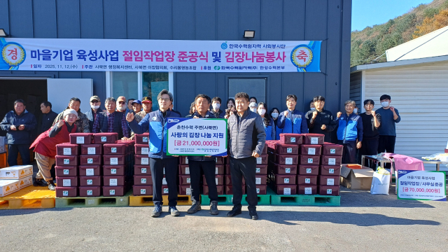 춘천 사북면행정복지센터(면장:이원영)는 12일 신포2리 절임 작업장 준공에 맞춰 사북면이장협의회(회장:김석포), 주민자치위원회(위원장:송은총), 한국수력원자력 한강수력본부 직원들과 소외계층 지원을 위한 김장 나눔 행사를 열었다. 이날 담근 김치는 150세대에 전달된다.