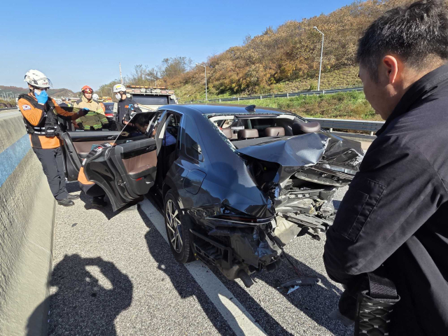 ◇12일 낮 12시48분께 원주시 가현동 영동고속도로 강릉방향 원주 JC 인근 도로에서 카니발, 그랜저GN7, 그랜저TG 차량이 잇따라 부딪쳤다. 사진=강원특별자치도소방본부 제공