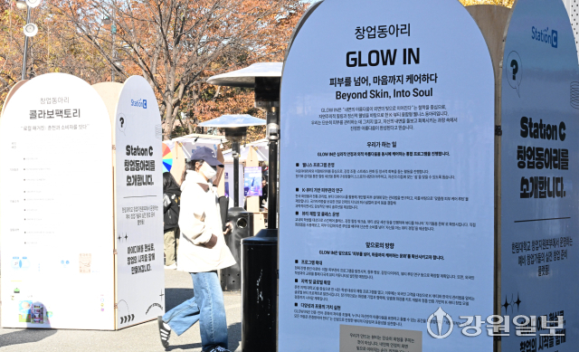 12일 한림대에서 열린 스타트업 IR 챌린지 DAY 2025년도 StationC 창업주간 행사에서 학생들이 각양각색의 창업 동아리 부스를 살펴보고 있다.
