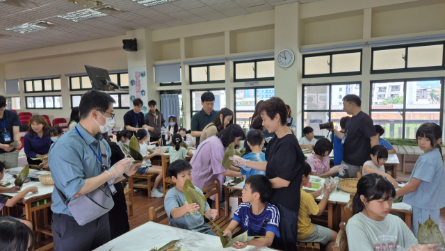 타이베이교육대학부설시범초등학교(臺北教育大學附設實驗國民小學)의 공개수업 교실에서 학생들과 연수단이 함께 대만 단오절의 전통음식 ‘쫑즈’ 만들기 체험을 하고 있다.
