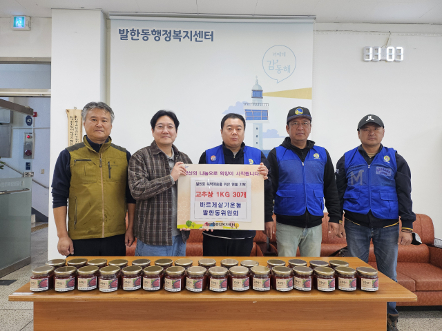 바르게살기운동 발한동위원회(위원장:이준영)는 지난 17일 발한동행정복지센터(동장:배미경)에 위원들이 직접 담근 수제 고추장(1㎏) 30개를 기탁,지역사회에 따뜻한 나눔을 실천했다.