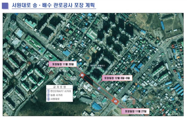 【원주】원주시상하수도사업소는 태장배수지 설치사업의 일환으로 송·배수관로를 설치하는 늘품사거리-우정청사거리 340m 구간에서 도로포장 임시복구공사를 실시한다고 19일 밝혔다.