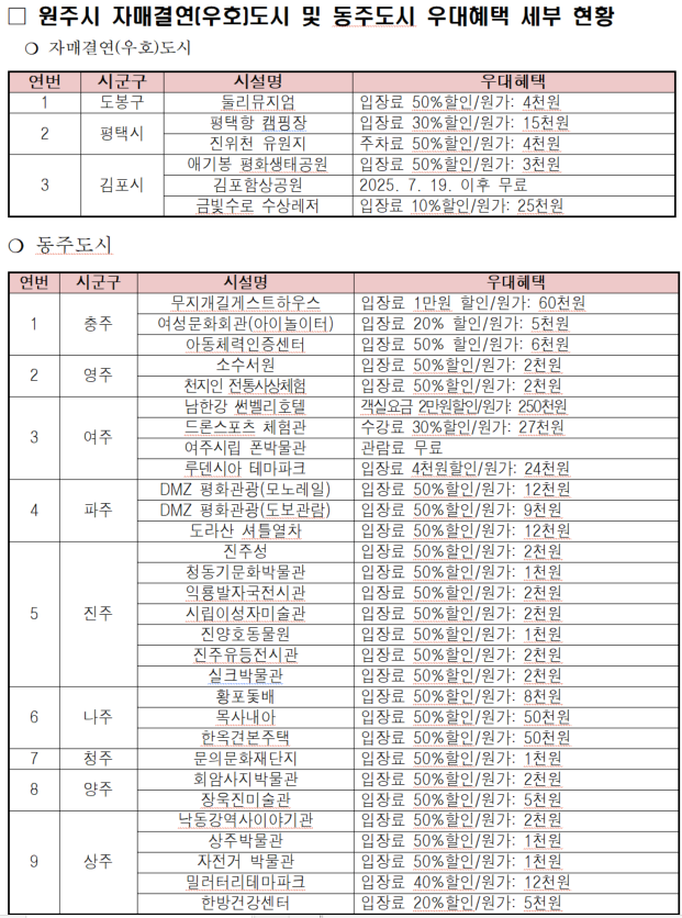 자치단체 이름에 '고을 주(州)'가 들어간 동주도시의 혜택은 더욱 폭넓다. 충북 충주시는 아동체력인증센터, 여성문화회관 등에서 최대 50% 할인 혜택을, 경북 영주시는 소수서원 등 전통문화 관광지 요금을 감면한다. 경기 여주시는 테마파크·박물관·호텔 등에서 무료 또는 할인 혜택을 지원하며, 경기 파주시는 DMZ 모노레일, 도라산 셔틀열차 등을 최대 50%까지 할인한다.