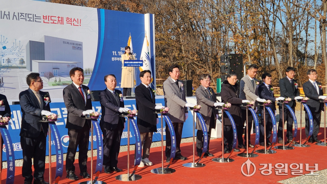 '반도체 소모품 실증센터' 착공식이 19일 오후 원주 부론일반산업단지 조성현장에서 김진태 강원특별자치도지사와 원강수 원주시장, 곽문근 원주시의회 부의장, 성경륭 상지대 총장, 허장현 강원테크노파크 원장, 박홍수 나노종합기술원장, 조창진 G1 회장 등 기관·단체장과 부론면 주민 200여이 참석한 가운데 열렸다.