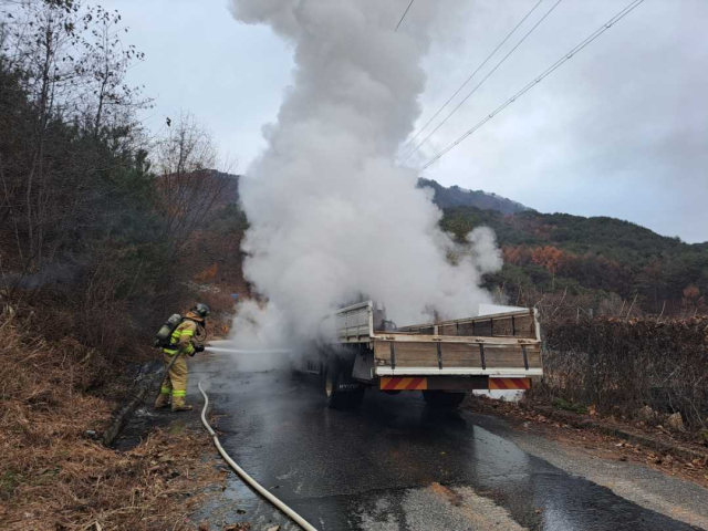 ◇20일 오전 7시45분께 양구군 동면 덕곡리고개길에서 5톤 메가트럭에 불이 났다. 사진=강원특별자치도소방본부 제공