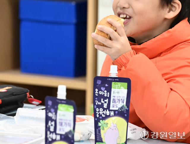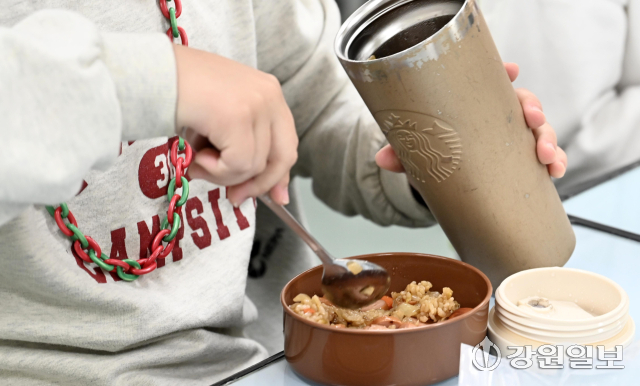 학교 현장에서 급식과 돌봄 업무를 맡고 있는 전국학교비정규직노조가 총파업에 돌입하며 급식이 중단된 20일 춘천시내 한 초교의 학생들이 학교에서 배부된 간편식과 집에서 싸온 도시락으로 점심을 해결하고 있다. 신세희기자